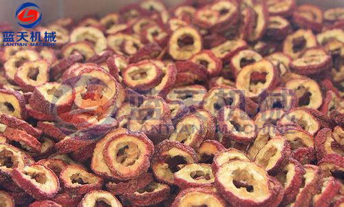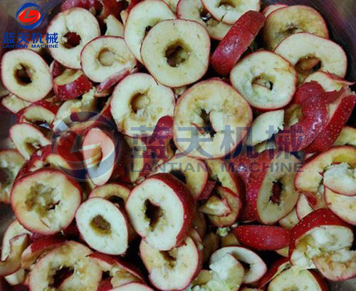 第二步:洗凈山楂果后,要盡快擦干其外表的水分,再進行切片處理,需要去除或保留果核。現(xiàn)在也有專門的切片機器,效率很高,且切片的厚薄均勻,一般在3mm左右。