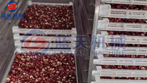 第三步:新鮮山楂片的含水率約為80%,干燥的目標含水率約為13%,使用空氣能熱泵型烘干機,將智能溫度設(shè)定為55°C左右的范圍,使山楂片所含的游離水大量蒸發(fā),熱風循環(huán)系統(tǒng)不斷輸送新風,將風量均勻的輸送至各層架,排風,促使蒸發(fā)的水份通過凝結(jié)水管路系統(tǒng)排出。