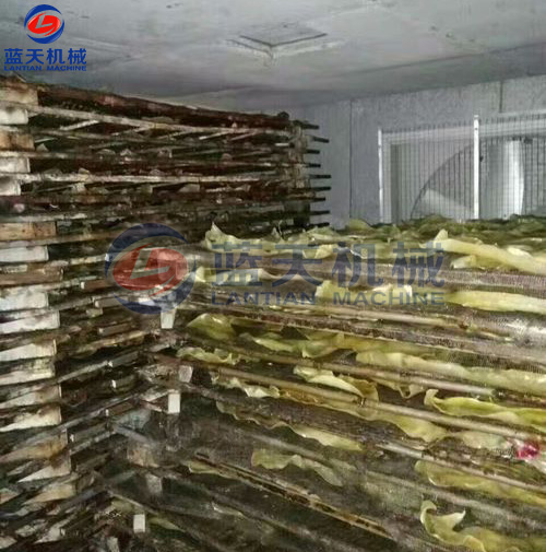 是利用太陽曬干的,整個過程需要持續四五天的時間,還需要工人在現場看管,但也避免不了蟲蟻灰塵的污染。如遇上陰雨天,豬皮曬干不及時就可能走味,給豬皮的干燥帶來諸多麻煩。