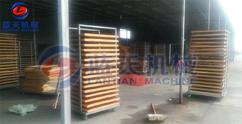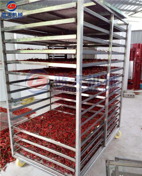 辣椒的堆放厚度:辣椒的堆放厚度力求一至,一般20~30厘米為宜,堆放太薄,透氣性好,風阻小,雖然有利于熱交換,但熱空氣與辣椒的接觸時間相對縮短,熱利用率低,若堆放太厚,則阻力增太,熱空氣無法穿透物層,烘干效果較差。