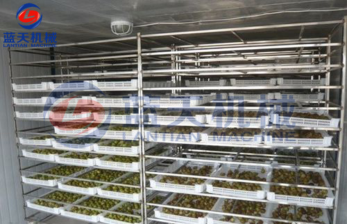 如為整顆烘干,需要的時間更長一些,先將果子均勻的鋪放在架子車上,推入無花果烘干機干燥25-30小時后,再推出烘房外陰涼的地方放置一天,再推入烘房內進行第二次的烘干。無花果烘干機一天的烘干量視機型規格決定,最少的以600-800 斤一個批次,最多的2000斤一個批次,10000斤甚至更大產能則考慮對吹及組合方式即可。