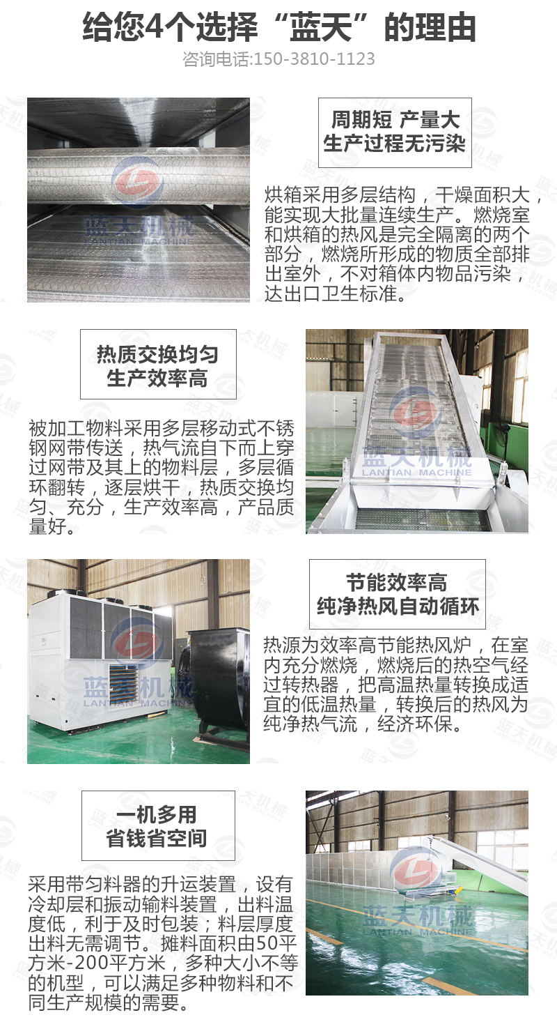 可烘干產量大:可大批量24小時連續式烘干處理,日加工產量可達到幾十噸,適合集中化烘干加工模式;
