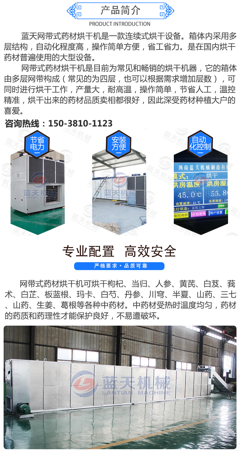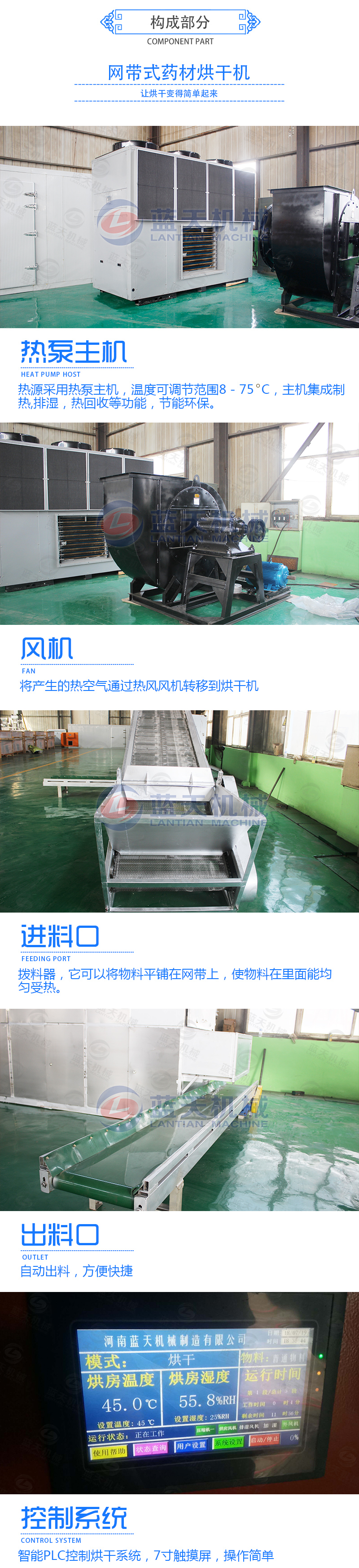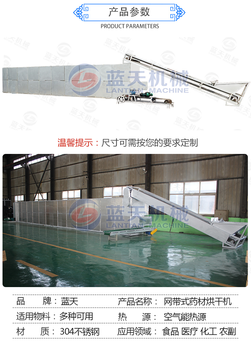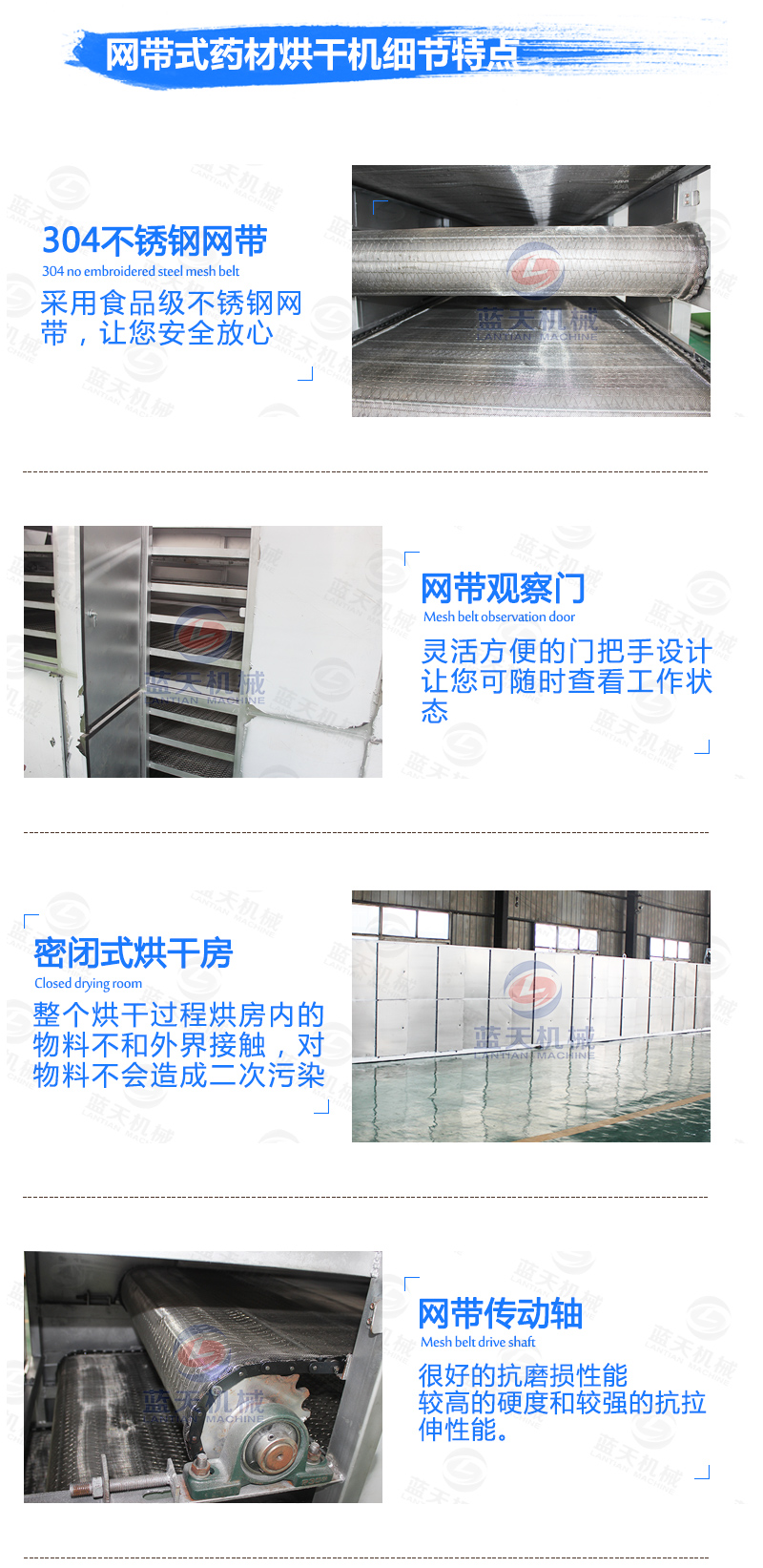 4、網帶式藥材烘干機采用分體設計,烘干箱采用的是不銹鋼材料,耐高溫,腐蝕。