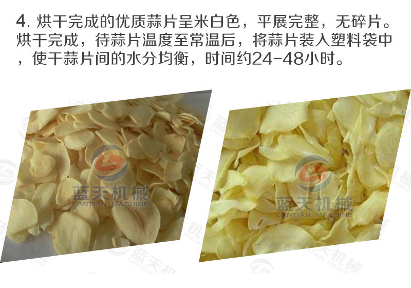 11、把蒜片均勻的鋪在蒜片烘干機設備的網格盤內,將網格盤插入物料車,將物料車推進烘干內。蒜片烘干過程中,溫度應控制在55~75 ℃之間,烘干時間為10~12小時。烘干后的蒜片標準為:片形正常、色澤凈白,水分含量為4~5%。