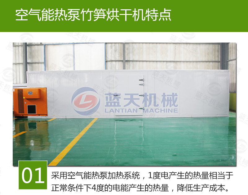 節能效率高、不受天氣限制:空氣源熱泵竹筍烘干機的運行費用只有燃油干燥機的40%,燃煤干燥機的60%和電熱加熱設備的30%,竹筍烘干機價格大大節省了烘干的成本為企業創造了直接的利潤。安裝竹筍烘干機只需要一塊占地不大的平地面積就可以了,安裝操作簡易 。