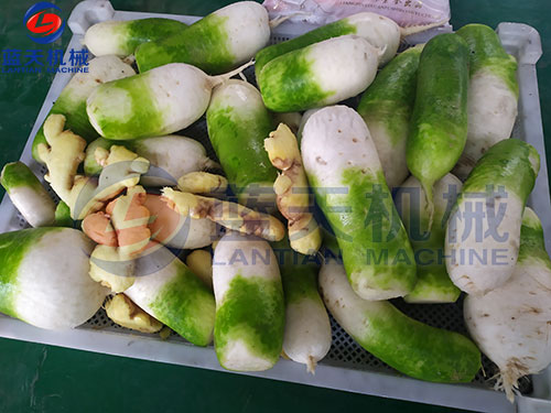 1、將新鮮出土的白蘿卜清洗干凈,量大的情況下,建議您可以選用毛輥脫皮清洗機(jī),清洗量大,速度快,效率高,您從圖片中可以看出來,清洗機(jī)不僅僅可清洗白蘿卜,還可以清洗其他物料,如:大姜、紅薯、土豆等